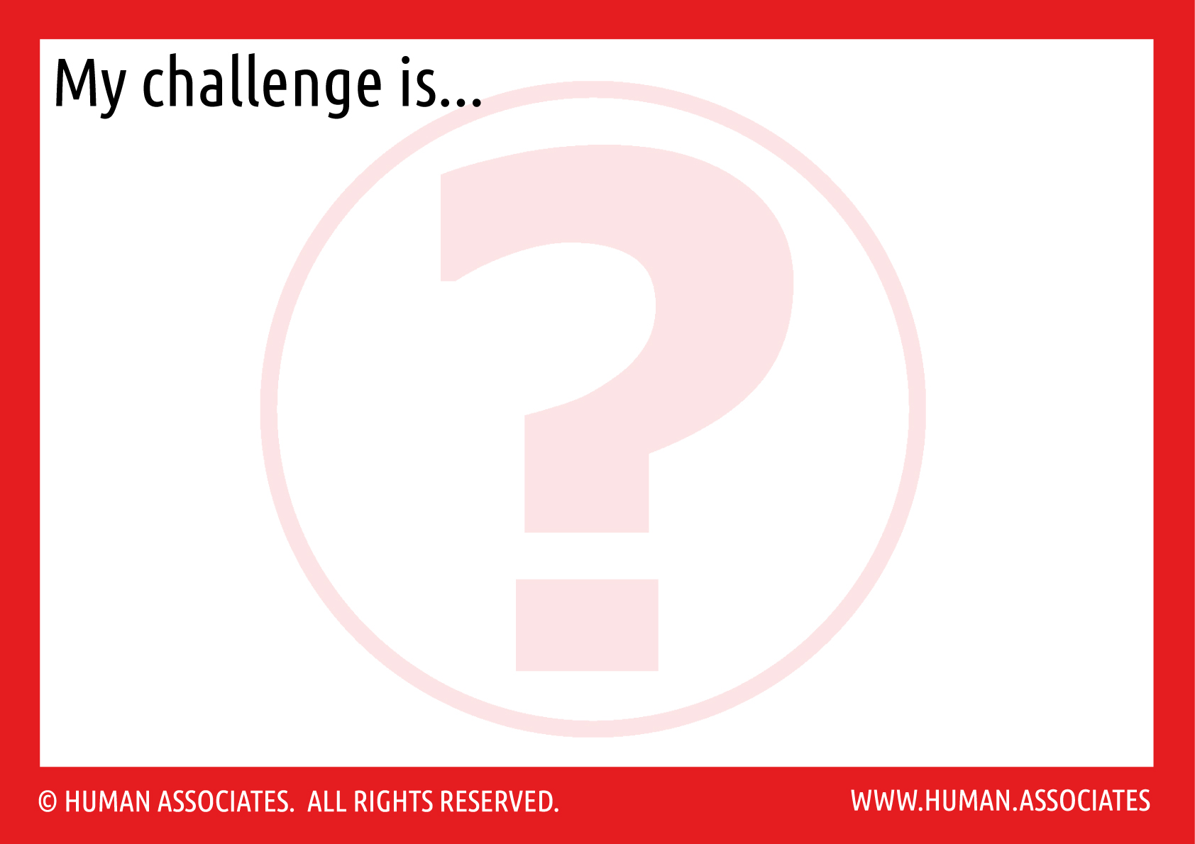The user identifies what is challenging them by completing the sentence ‘My challenge is…’ The user may have a number of challenges and by working through them and writing them down they can identify their most significant challenge or a specific challenge that they would like to navigate using the process.