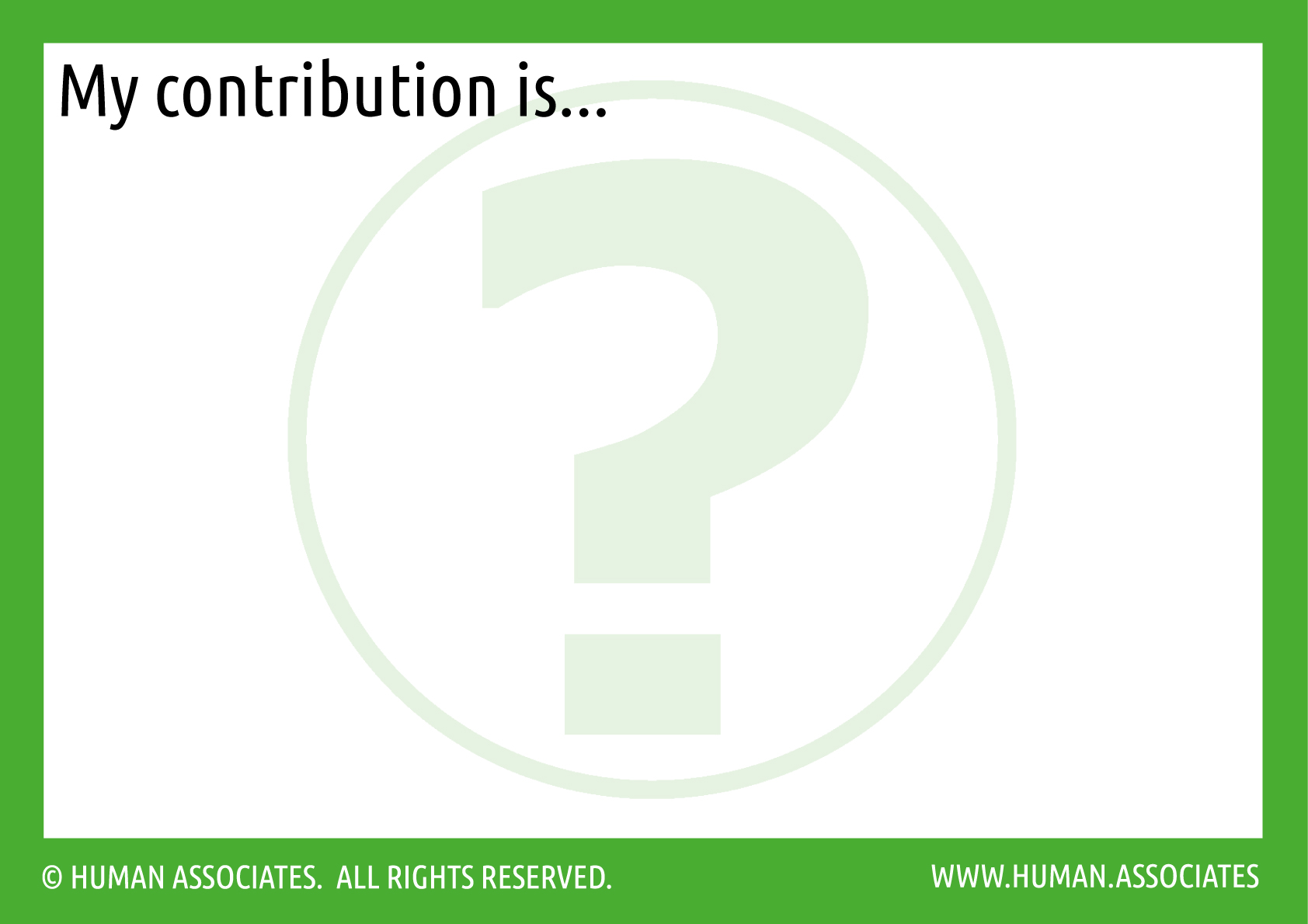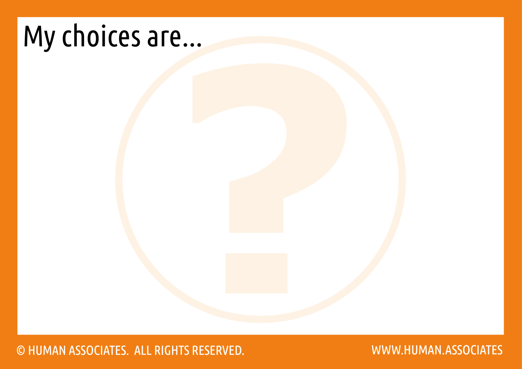 Understanding and claiming contribution naturally opens up a range of choices for a user. These choices may range from not doing anything and keeping the situation exactly the way it is all the way through to choosing to take some radical action. These choices are written down by completing the sentence ‘My choices are…’ this process of writing down choices provides the basis for taking action to resolve the tension or to navigate the challenge.